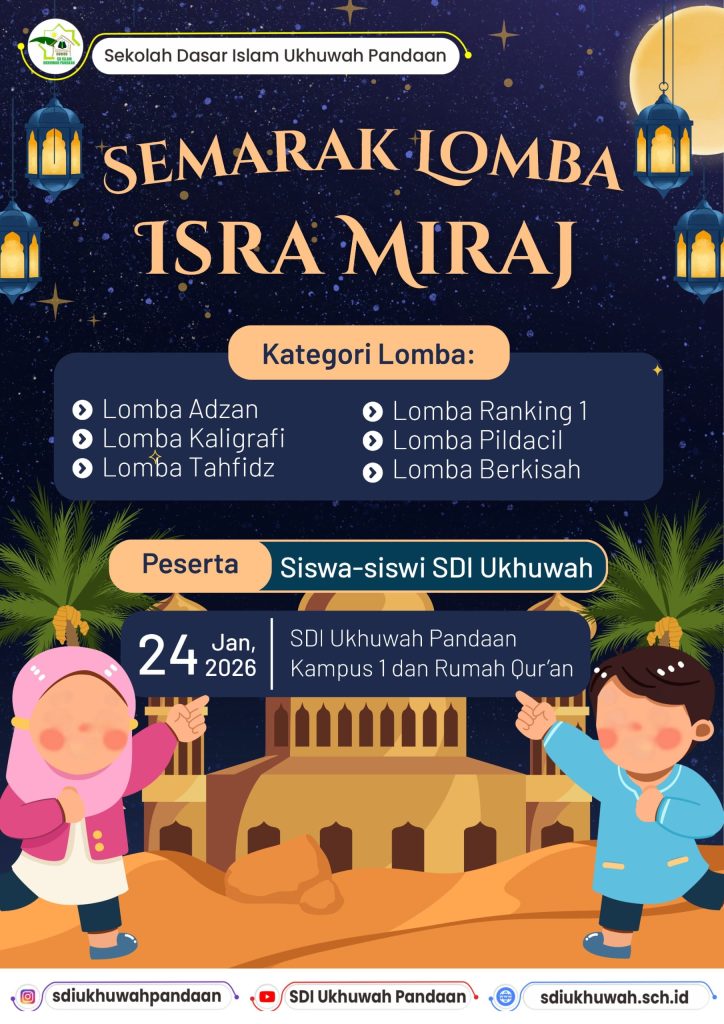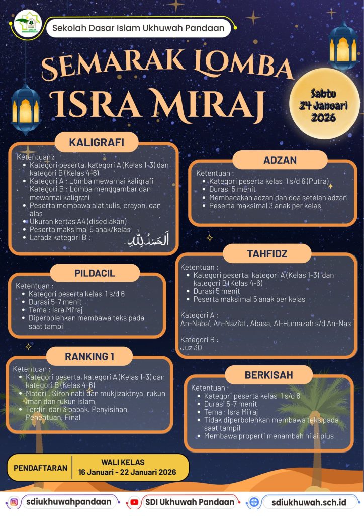 Dalam rangka menyemarakkan momen Isra Mi’raj, SD Islam Ukhuwah Pandaan akan mengadakan Semarak Lomba Isra Mi’raj dengan rincian sebagai berikut:📌 Kategori Lomba:Lomba AdzanLomba KaligrafiLomba TahfidzLomba Ranking 1Lomba PildacilLomba Berkisah👧🧒 Peserta:Siswa-siswi SDI Ukhuwah Pandaan🗓 Hari/Tanggal:Sabtu, 24 Januari 2026📍 Tempat:SDI Ukhuwah Pandaan Kampus 1 dan Rumah Qur’anBagi Ayah/Bunda yang anandanya ingin mengikuti lomba-lomba tersebut, silakan menghubungi wali kelas masing-masing untuk informasi dan pendaftaran lebih lanjut.Diharapkan seluruh ananda dapat mengikuti kegiatan ini dengan penuh semangat dan antusias.Terima kasih atas perhatian dan kerja samanya.